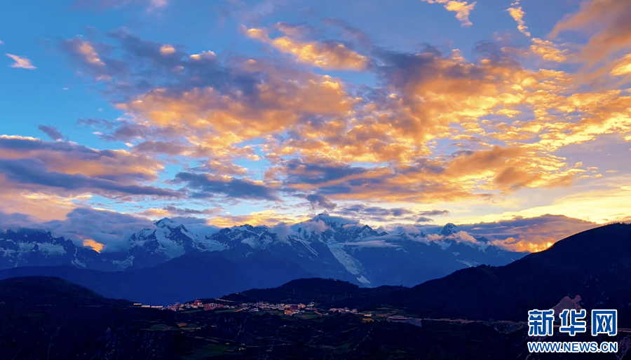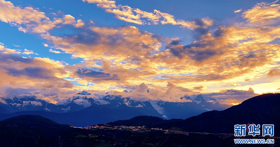 近日,攝影師在梅里雪山附近,用延時攝影記錄到一場美麗的晚霞。畫面中,雪山和白云被落日余暉映照成璀璨的金色,碧空則藍得深邃,整個畫面看起來如夢似幻,讓人移不開眼睛。(完)(李春雷)