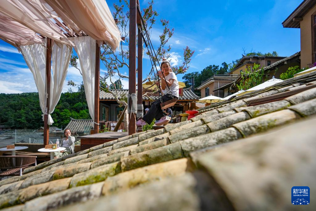 7月27日,幾名游客在樂居村休閑(無人機照片)。新華社記者 陳欣波 攝