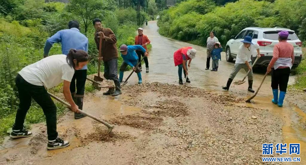 彝良縣海子鎮干部群眾正在清理道路淤泥。(受訪單位供圖)