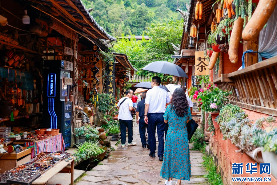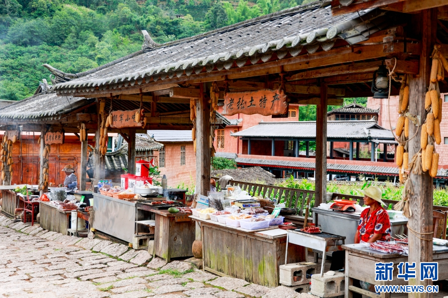 那柯里茶馬驛站景區內店鋪林立(8月5日攝)。新華網發(劉云 攝)