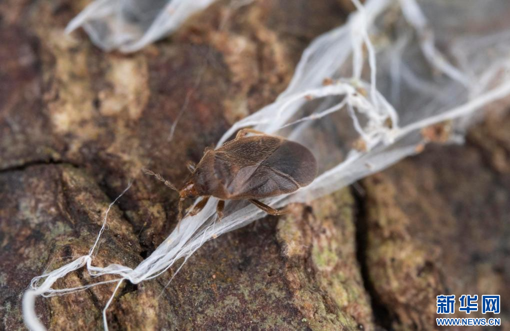 足絲蟻網巢上的中華喜絲蝽成蟲。新華網發