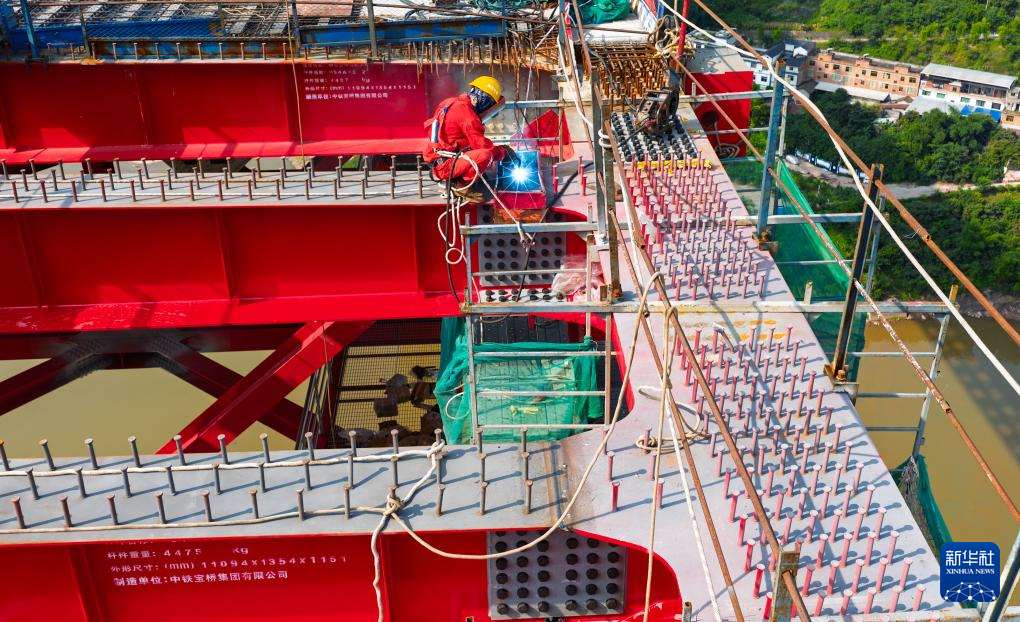 8月20日,在新市金沙江特大橋建設現場,工人在焊接合龍段桁梁(無人機照片)。新華社發(曾三東攝)