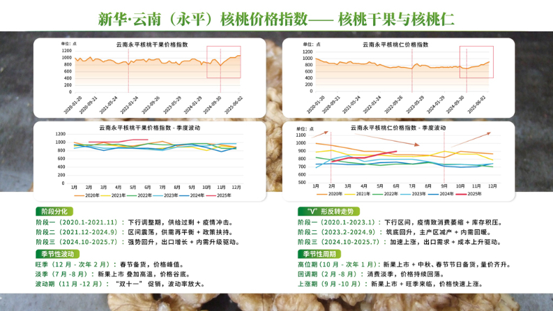 致辭環節后,新華指數研究院農業市場研究中心核桃產業分析師對指數做了解讀。指數運行結果顯示,2024年10月起,永平核桃市場顯著復蘇——干果價格指數突破1000點,核桃仁價格指數“V”形反轉,鮮果價格指數從震蕩轉為平穩;從全國視野看,2020-2024年云南核桃出口均價高于全國及新疆,核桃仁成出口主力,產業向高附加值轉型趨勢明顯。