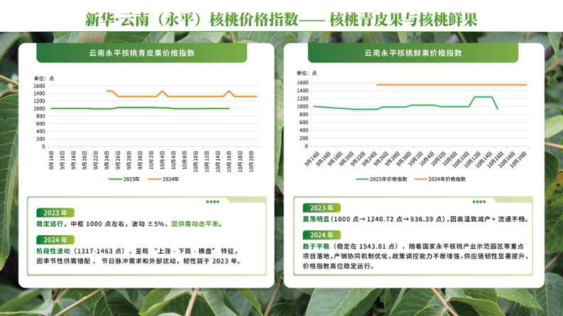 此次發布的“新華?云南(永平)核桃價格指數”,覆蓋核桃青皮果、鮮果、干果、核桃仁四大品類,以1000點為基期,采集杉陽鎮、廠街彝族鄉等8個主產地交易數據,形成動態監測體系,既為種植戶提供“以銷定產”的數據參考,也推動“優質優價”機制落地,助力當地核桃產業高質量發展。