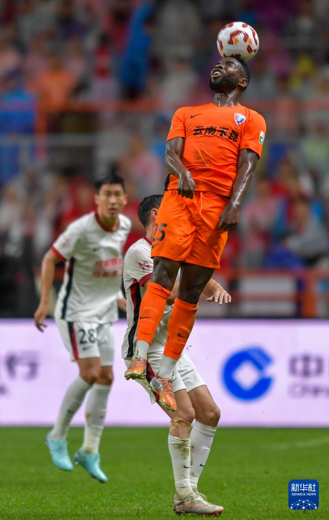 8月23日,云南玉昆隊球員奧斯卡(上)在比賽中爭頂。新華社記者 陳欣波 攝