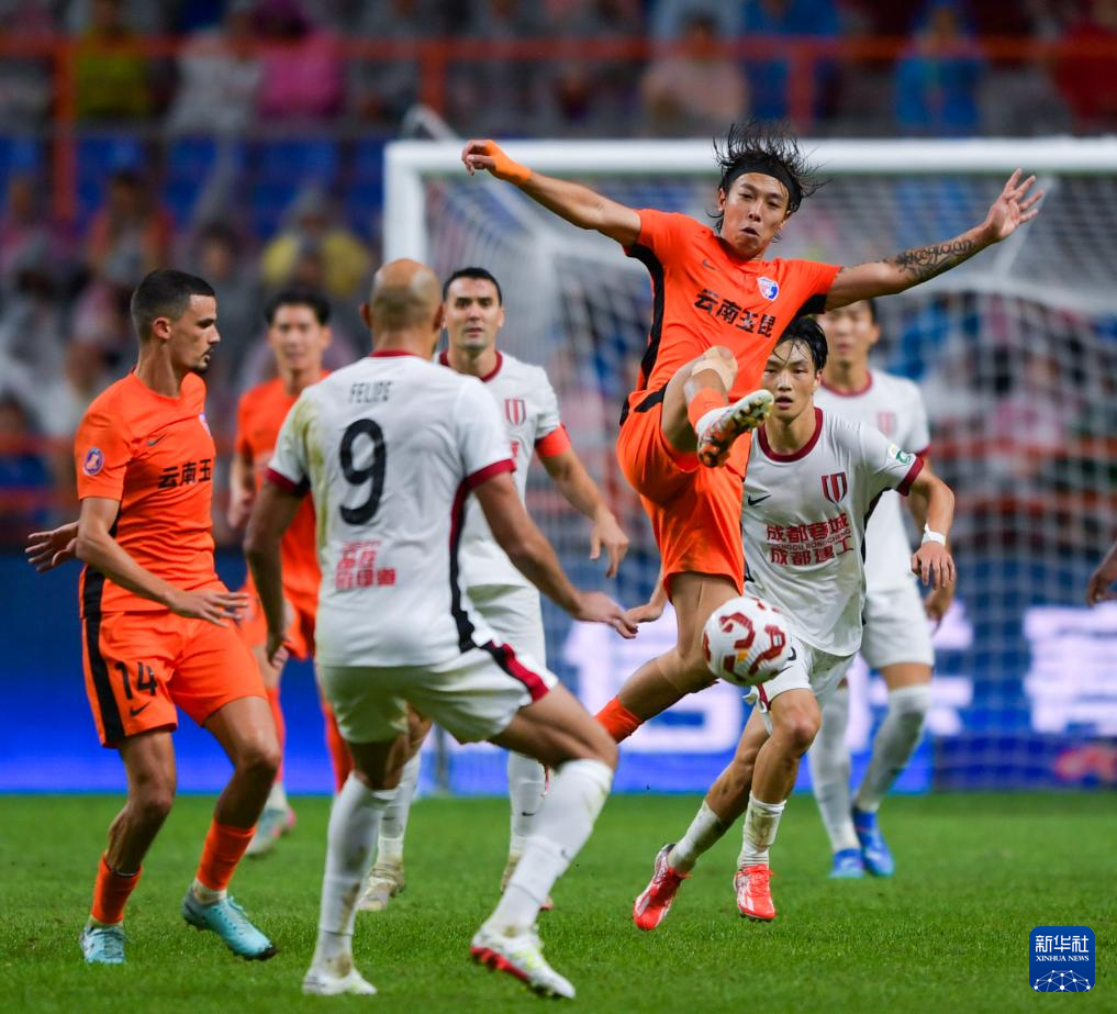 8月23日,成都蓉城隊球員楊明洋(左)與云南玉昆隊球員葉楚貴在比賽中拼搶。新華社記者 陳欣波 攝