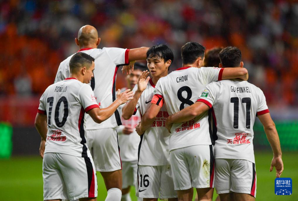 8月23日,成都蓉城隊球員在比賽中慶祝進球。新華社記者 陳欣波 攝
