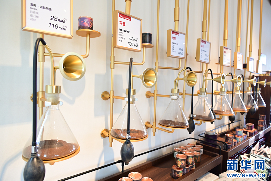 在景邁山北歸咖倉,游客可通過聞香瓶感受不同咖啡的風味(8月26日攝)。新華網發(劉起 攝)