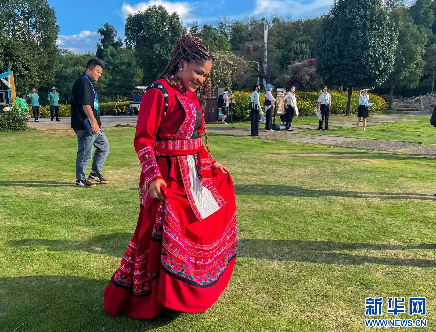 換上當地民族服飾,來自赤道幾內亞的《真實赤幾》雜志社長米拉格羅薩對著鏡頭擺起了舞蹈動作,她喜歡這里?!拔液芟矚g中國傳統服飾,每次穿上都感覺很開心?!泵桌窳_薩說。