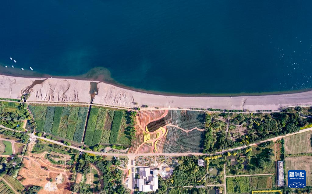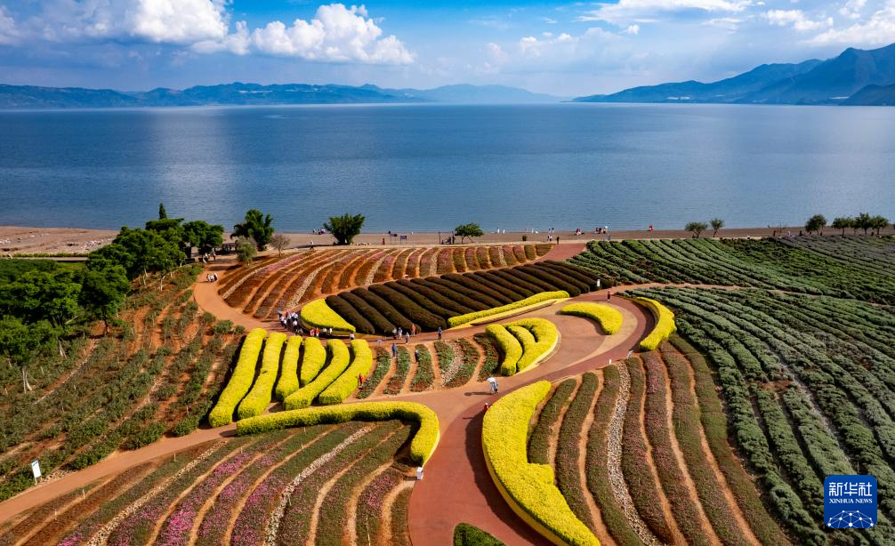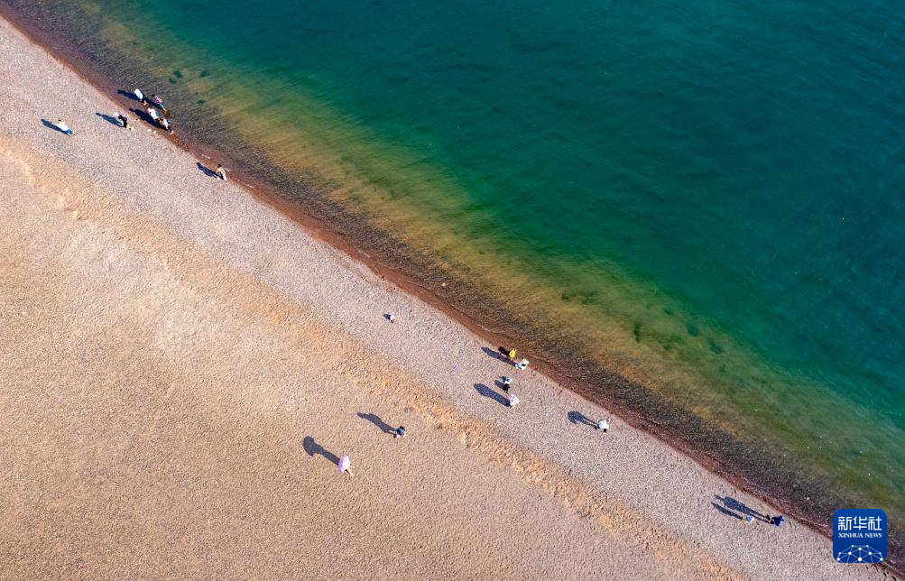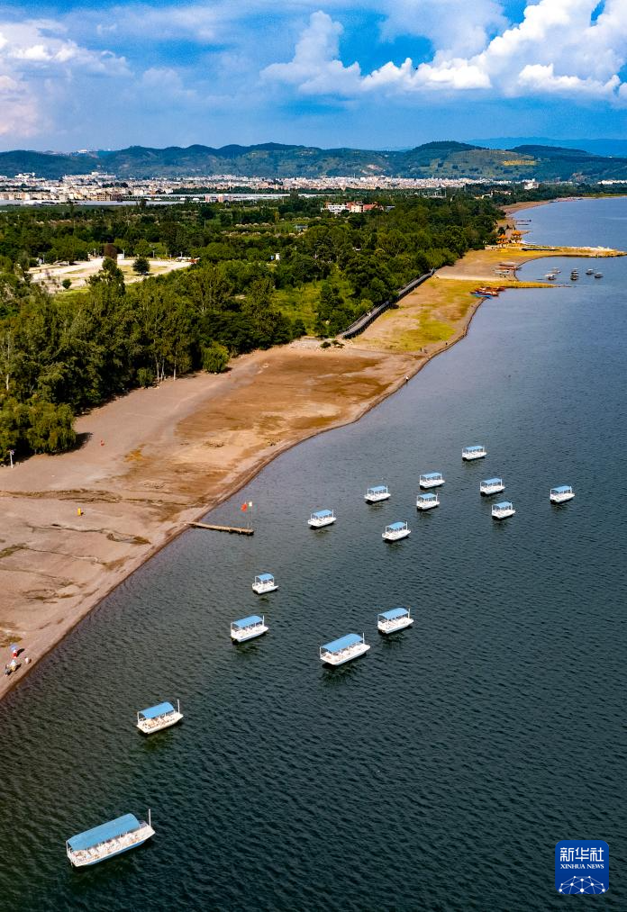9月8日,游客在撫仙湖畔游玩(無人機照片)。新華社記者 陳欣波 攝