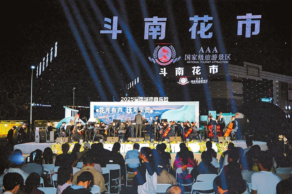 日前,“花開有聲 樂見呈貢”2025城市音樂會系列首場活動“斗南交響花之夜”在斗南花市上演。