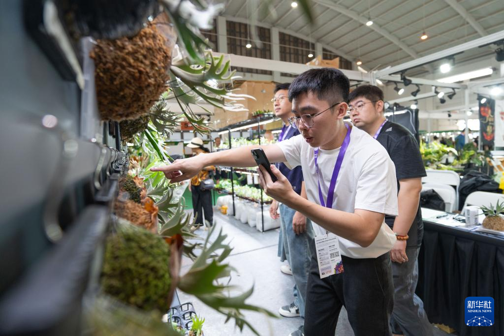 9月19日,參展商在第二十三屆中國昆明國際花卉展直播推介綠植。新華社記者 高詠薇 攝