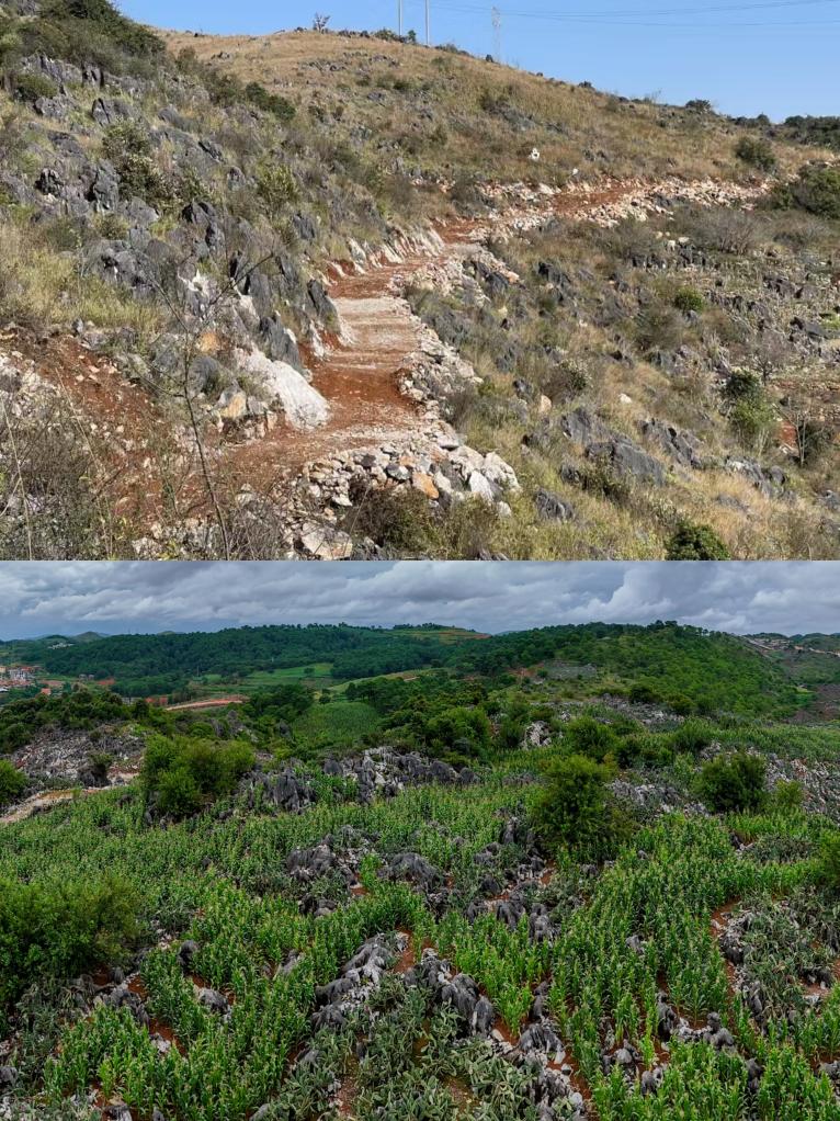 這是一張拼版照片。上圖:開展仙人掌規?;N植前的莊子田居民小組后山(中共文山市委宣傳部供圖);下圖:8月7日在莊子田居民小組后山拍攝的仙人掌種植基地。(無人機照片)新華社記者 彭奕凱 攝