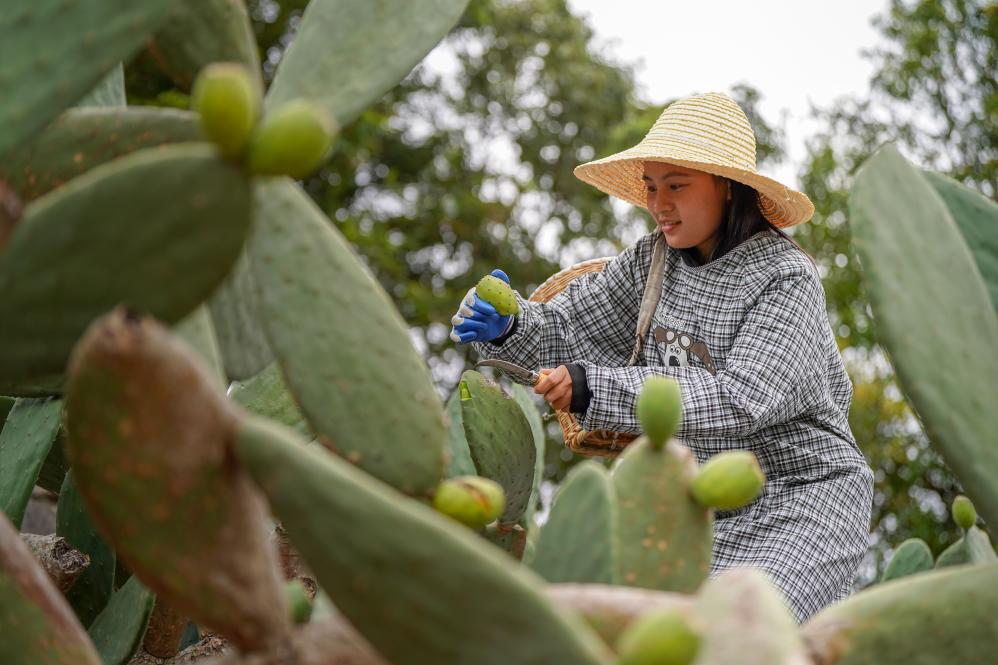 8月7日,莊子田居民小組村民在仙人掌種植基地采摘仙人掌鮮果。新華社記者 彭奕凱 攝