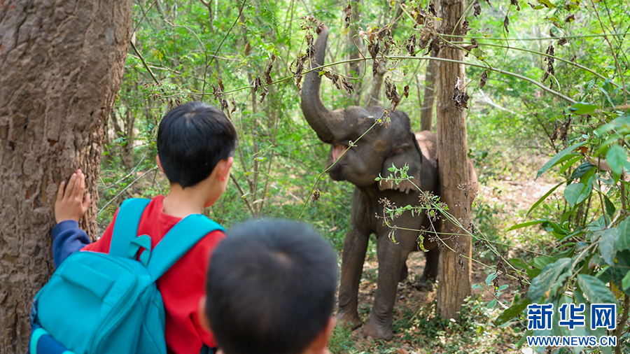 在研學導師的帶領下,孩子們遠距離觀看亞洲象(視頻截圖)。新華網發