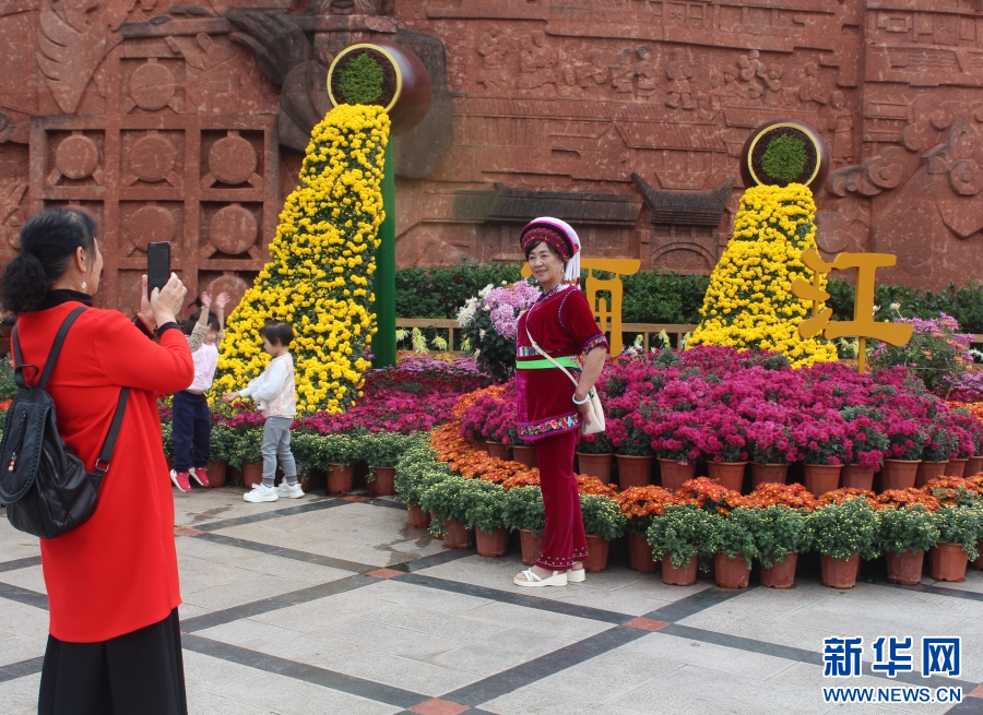 游客在麗江古城賞菊留影(9月29日攝)。新華網發
