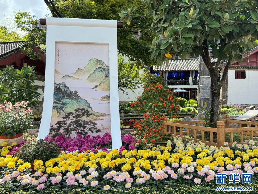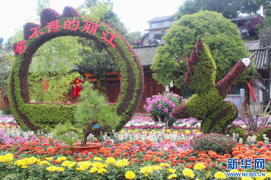 菊花主題造景裝點麗江古城的街巷(9月29日攝)。新華網發