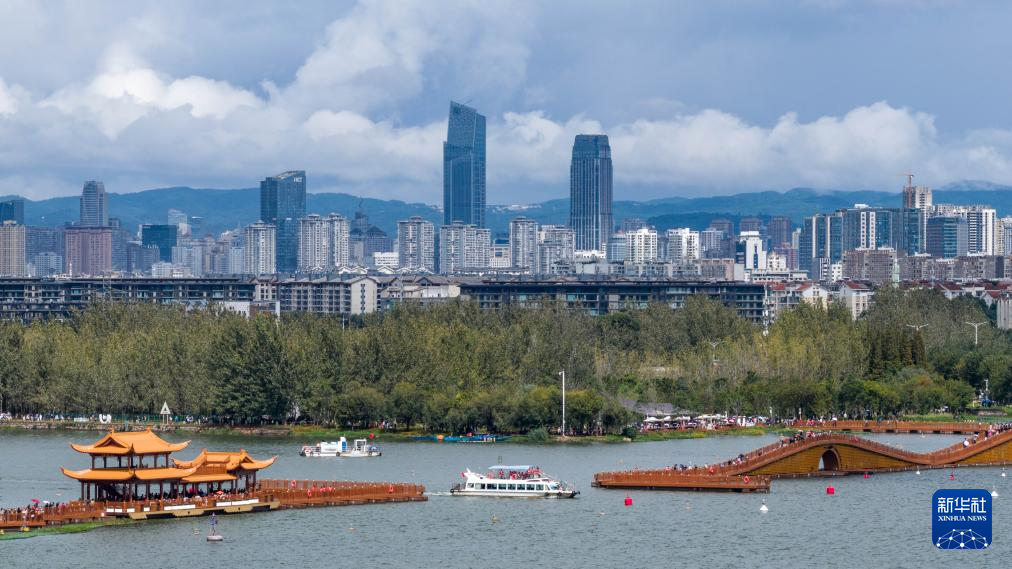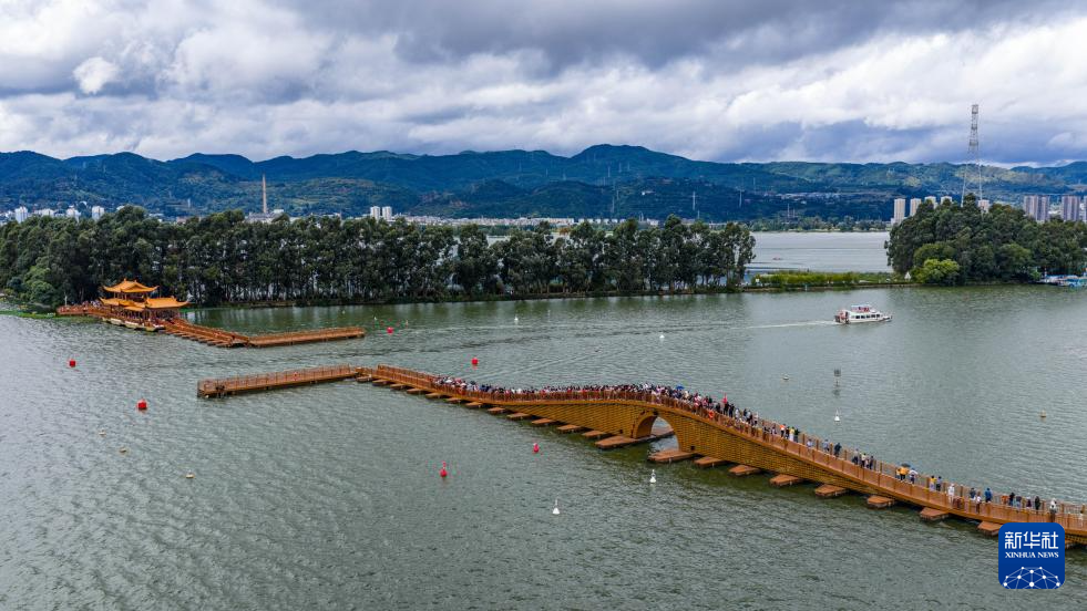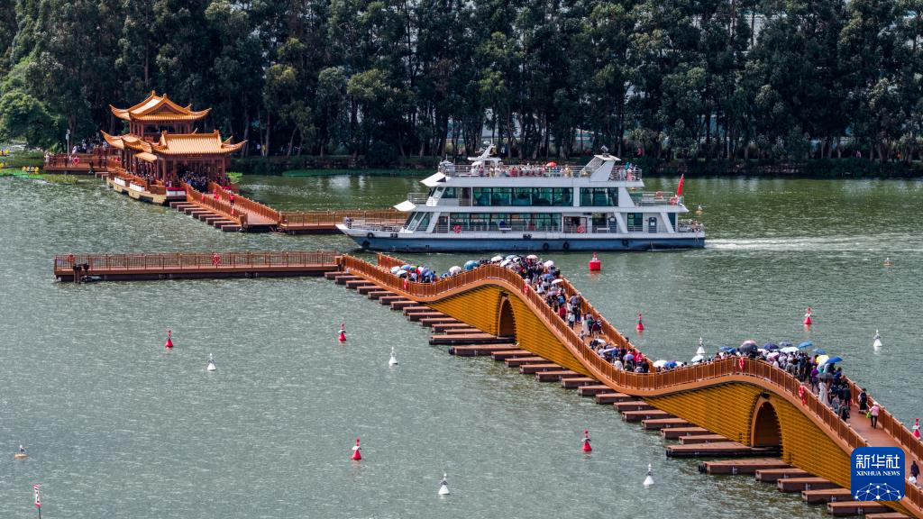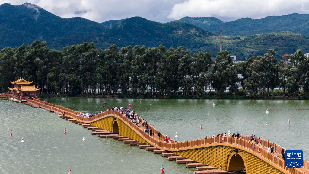 10月1日,人們在位于昆明滇池草海的東風壩開合浮橋上觀光游玩(無人機照片)。