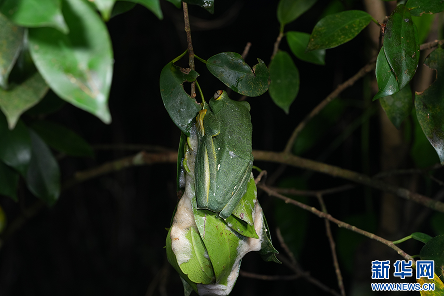 趴在樹葉上的黑蹼樹蛙,下面則是卵泡(資料圖)。新華網發(張鵬 攝)