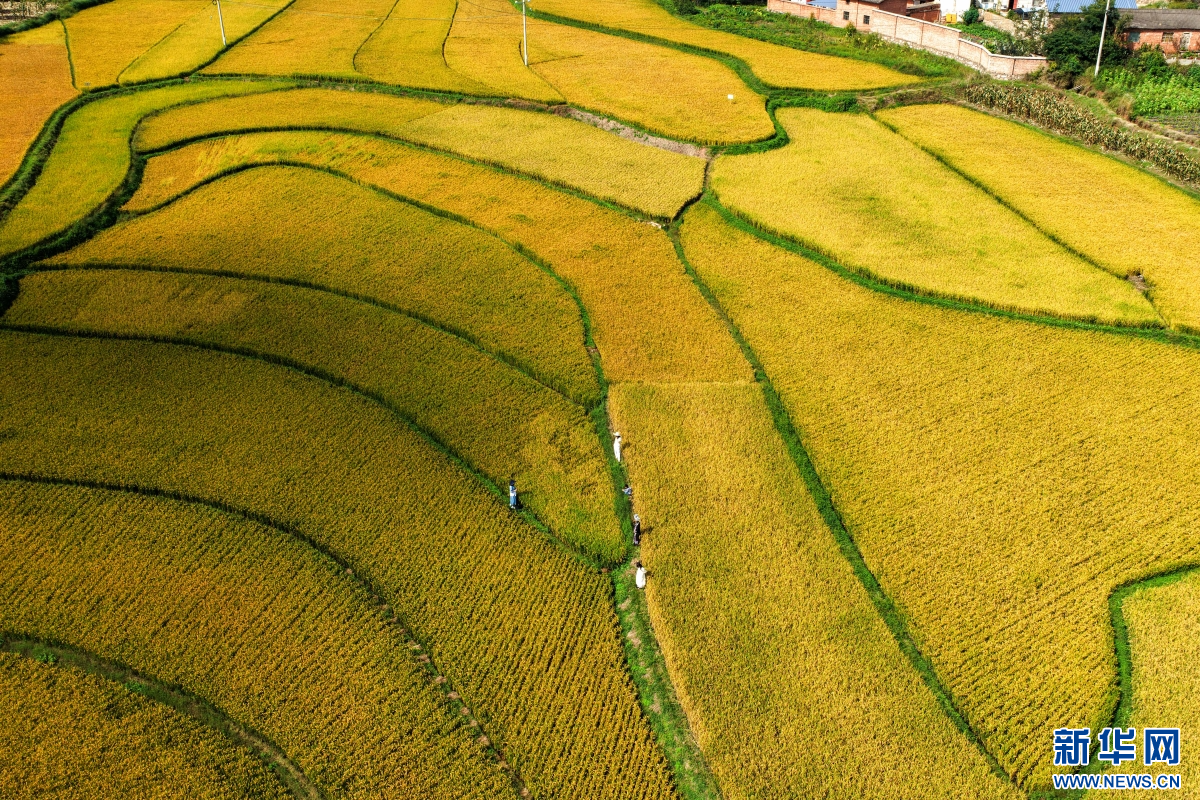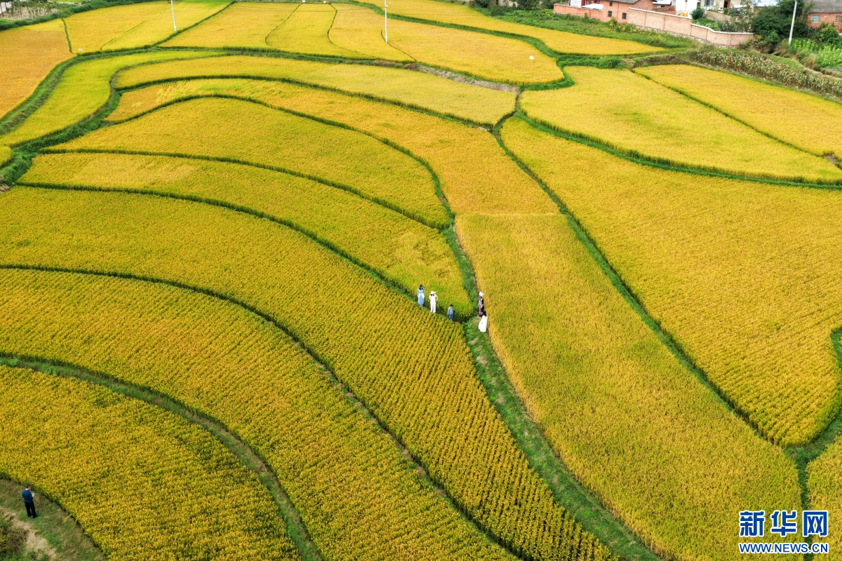 秋日里,云南省曲靖市沾益區龍華街道紅瓦房村,稻浪層層翻滾,在陽光照耀下泛起金光??罩懈╊?,田埂縱橫交錯,勾勒出優美的線條,吸引游客前來游玩欣賞,放松休閑。(孫文來)