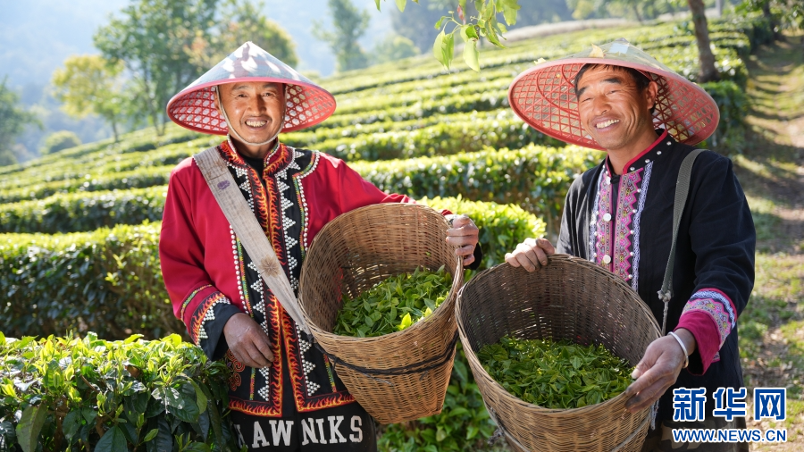 鎮沅彝族哈尼族拉祜族自治縣五一茶莊園的茶園里,茶農展示剛剛采摘的茶葉(3月26日攝)。新華網發(王楊靜 攝)