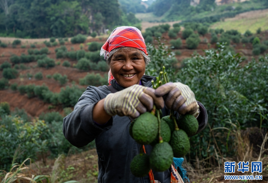一名果農在孟連縣一處牛油果種植基地內展示剛采摘的牛油果(2024年10月29日攝)。新華社記者 陳欣波 攝