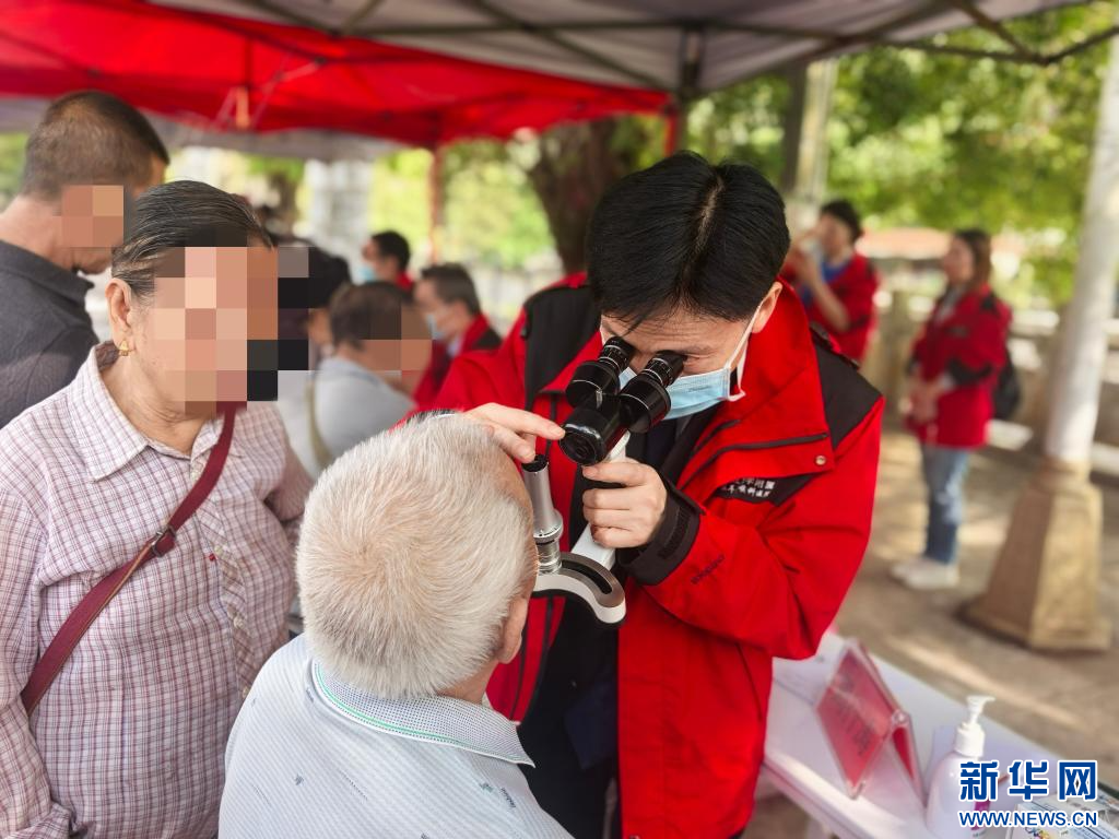 復旦大學附屬眼耳鼻喉科醫院院長周行濤在義診現場為當地群眾做眼部檢查。新華社記者 李恒 攝