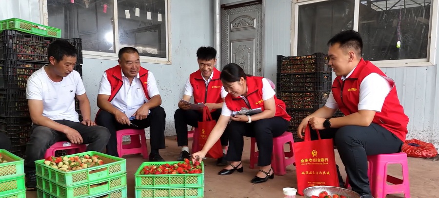 金融機構工作人員與草莓種植戶交流(資料圖)。