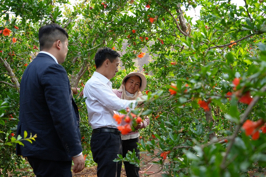 金融機構工作人員了解種植戶石榴長勢(4月28日攝)。